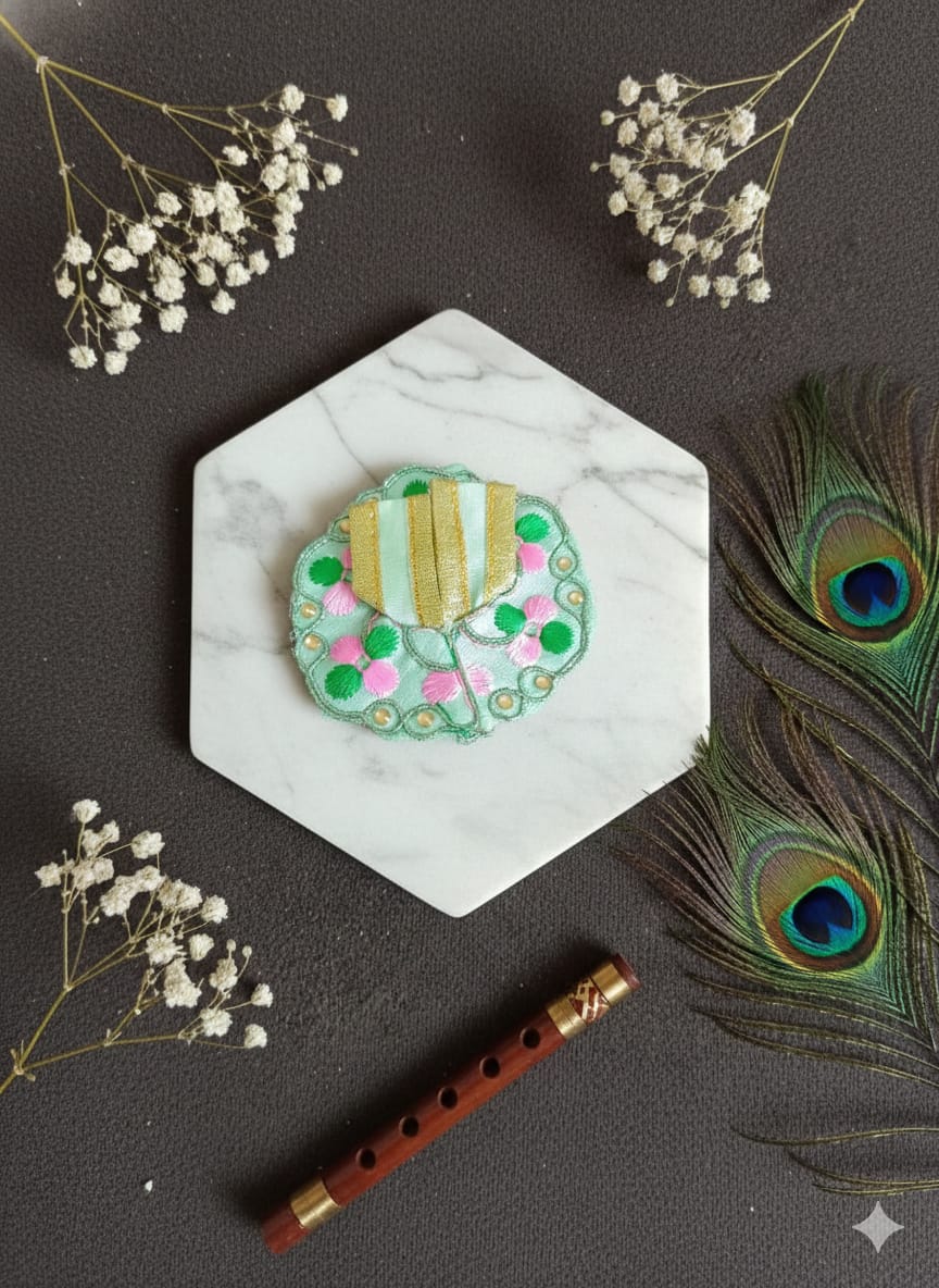 This poshak features a delightful multicolor pattern with golden zari accents, giving it a festive yet graceful look. The soft and lightweight fabric ensures easy draping and a comfortable fit for tiny Bal Gopal Ji idols.